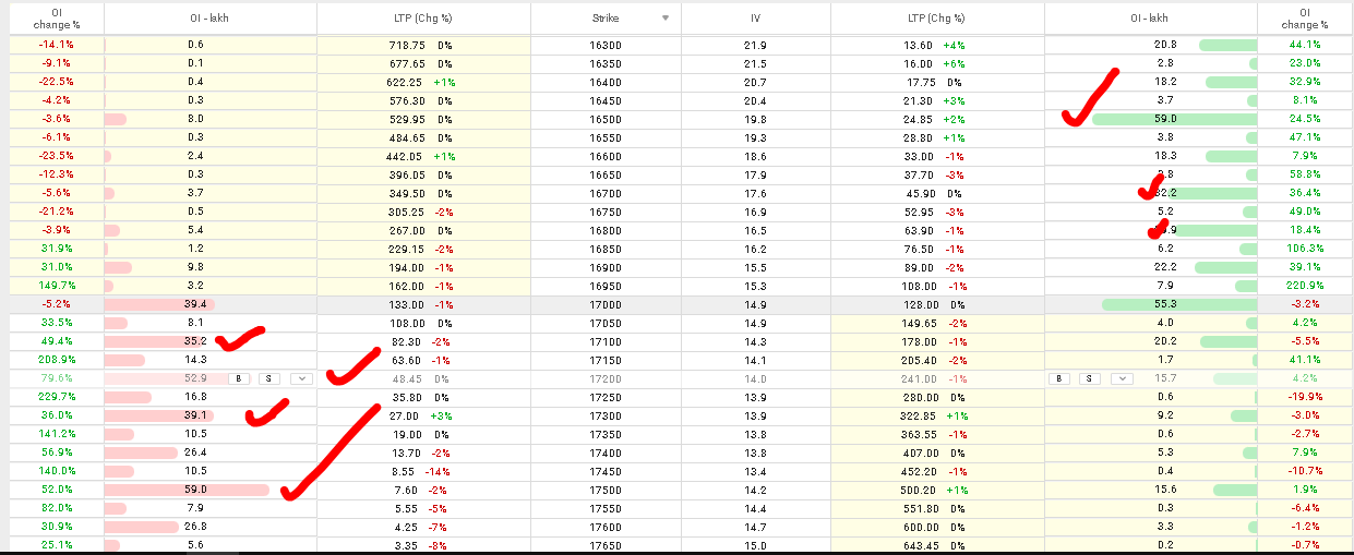 Below you can see more big red bars compared to green bars. The red bars on Call side(left side) are various resistances formed. From sellers perspective Calls selling has more OI which means Sellers are betting than index is not going up tomorrow beyond these resistances which are 17100,17200,17300 and 17500. They are also strong on markets not falling beyond 16500 support.