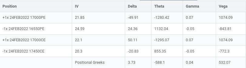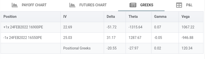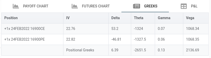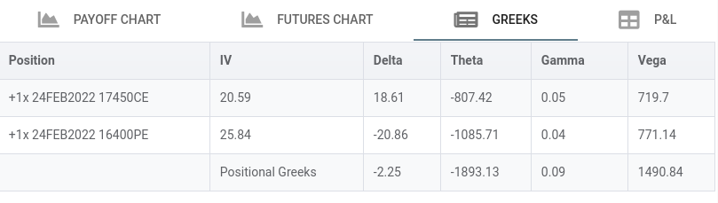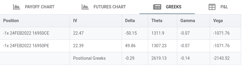 - Please notice Theta is now double that is time decay is double and negative(we loose money as time decay happens) of what is for each option separetely.