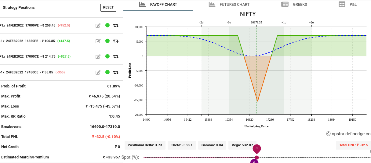 - Delta is near neutral and slightly negative where we make money when price spot moves on either side drastically beyond strike prices for Call and Put. ( around news like RBI New release is good time to try this strategy)